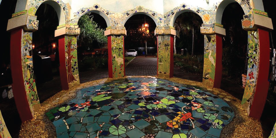 Piece Description: Complete interior coverage of Yacht Basin Park gazebo, reflecting local flora & fauna in mosaic.