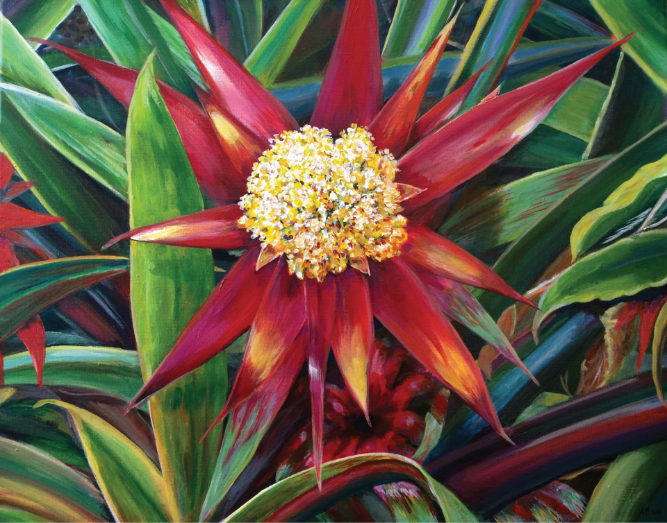 Piece Description: Acrylic painting of bromeliads bursting with yellow blooms and true reds from artist’s photograph.