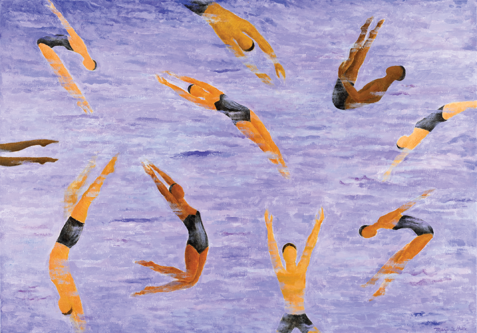 Piece Description: The Bathers series is inspired by my years as a synchronized swimmer and my love of water. Figures in the series––mostly women––are each absorbed in their own, tranquil universe. But in “Everybody In,” the introduction of men swimmers changes the dynamics; figures interact with each other; an energetic, playful exuberance replaces the serenity. The various skin tones in “Everybody In” underline the theme of inclusion.