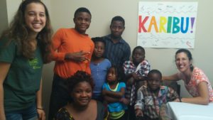 American volunteers Lilah Katz (far left) and her mother, Sharon Fine (far right), welcomed (top row from left) Fikiri, Onike, Paluki and Bienvenie, and (bottom row from left) Cecil, Oliva and Jeteme.