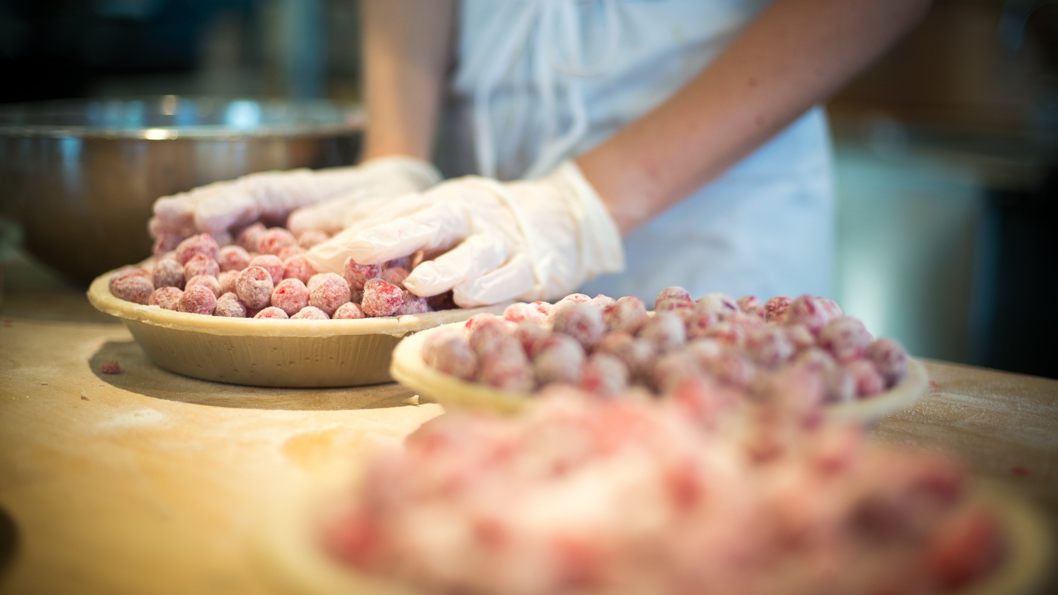 An employee at Grand Traverse Pie Co. in Michigan makes cherry pies. The company has been shipping pies since 1998, when people still had to phone in their orders.