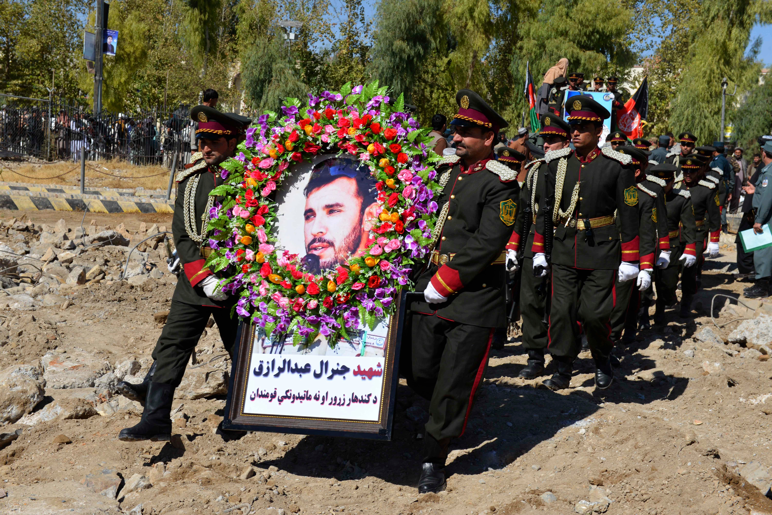 Guards of honor carry a photo of Brig. Gen. Abdul Raziq, Kandahar police chief, at his burial ceremony in Kandahar in October. In by December 30, 2018Leave a Comment Guards of honor carry a photo of Brig. Gen. Abdul Raziq, Kandahar police chief, at his burial ceremony in Kandahar in October.