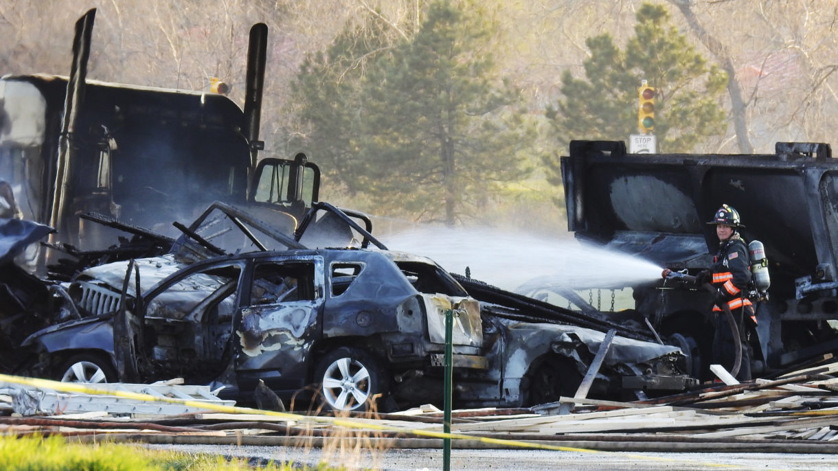 Witnesses reported a chain reaction of collisions, followed immediately by a large fire. The truck that police say started the crash was carrying a flatbed trailer full of lumber. Two-by-fours were strewn across the road like matchsticks. Diesel fuel also spilled on the roadway, fire officials said.