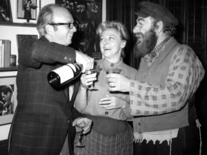 Producer Harold Prince celebrates the 1,254th sold-out performance of Fiddler On The Roof in 1967 with actors Maria Karnilova and Herschel Bernardi.